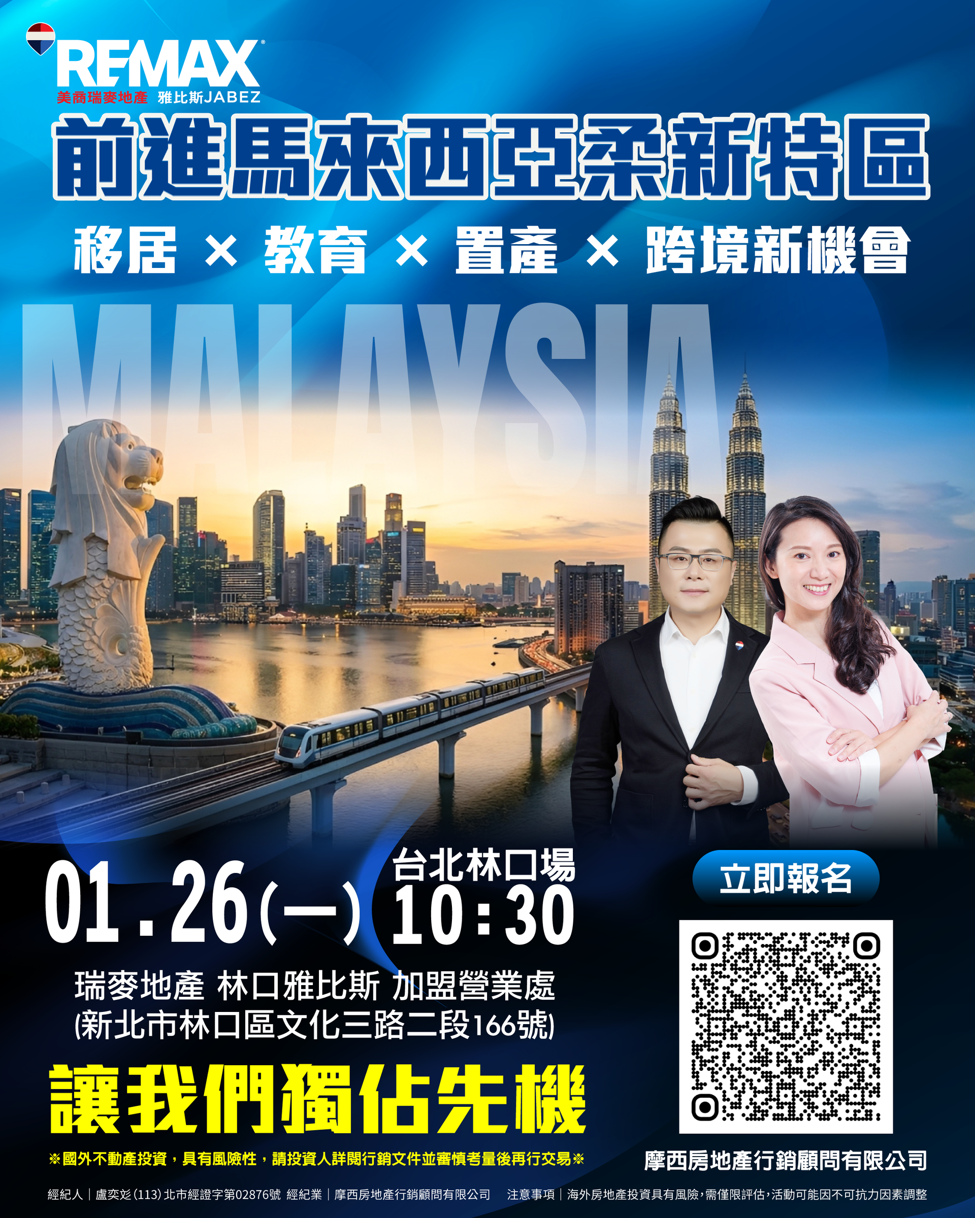 【前進馬來西亞柔新經濟特區】分享會 🌏【前進馬來西亞柔新經濟特區】分享會 新加坡&馬來西亞 跨海捷運(RTS)即將通車! 柔新經濟特區 房市迎來三重紅利: 🚆 交通樞紐通車 → 通勤可達新加坡 📈 區域價值上升 → 房價與租金潛力攀升 🏙 跨境生活新趨勢 → 新加坡工作、柔佛居住成為可能 本場分享會帶您一次掌握: ✔ 柔新經濟特區政策與產業布局 ✔ 交通建設引爆的房產成長機會 ✔ 馬來西亞國際教育與移居資產整合 📌 提前布局,抓住亞洲下一個跨境黃金走廊! 📅 活動資訊 🗓 日期|1/26(一) 🕙 時間|10:30開始 📍 地點|瑞麥地產林口雅比斯加盟營業處 新北市林口區文化三路二段166號 下方填寫報名資訊,免報名費 適合關注海外教育、資產配置、長期居留與退休布局的您,名額有限,歡迎報名參與。 📞 洽詢電話:(02)2601-6603 盧奕彣(113)北市經證字第02876號 摩西房地產行銷顧問有限公司 ※ 海外房地產投資具風險,請審慎評估。活動內容以現場說明為準。